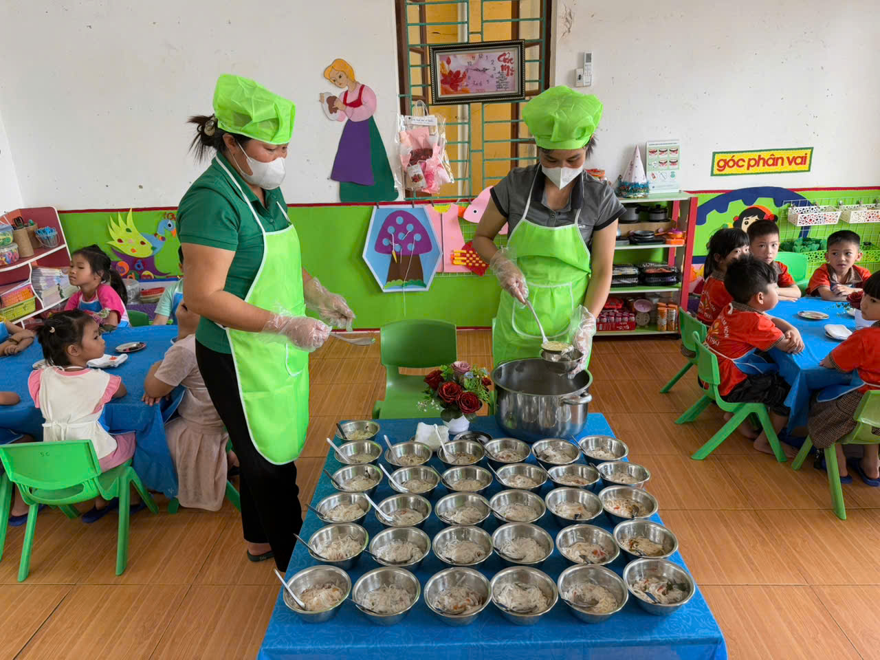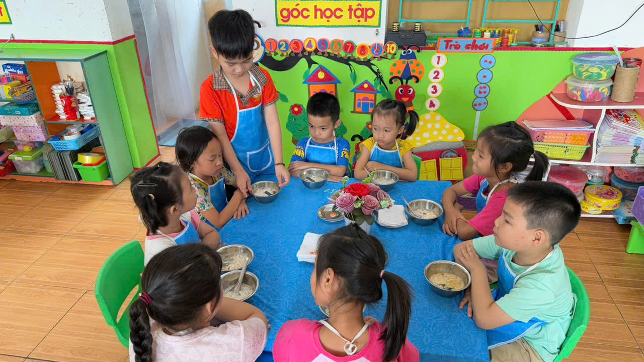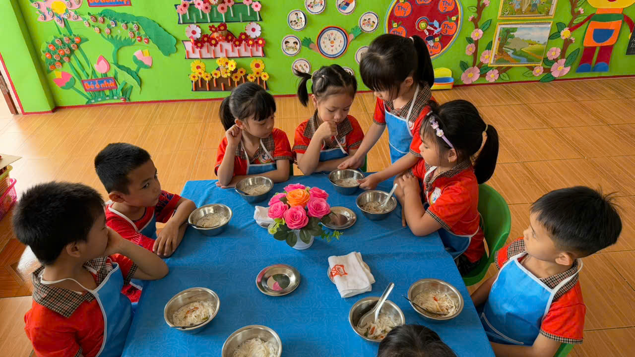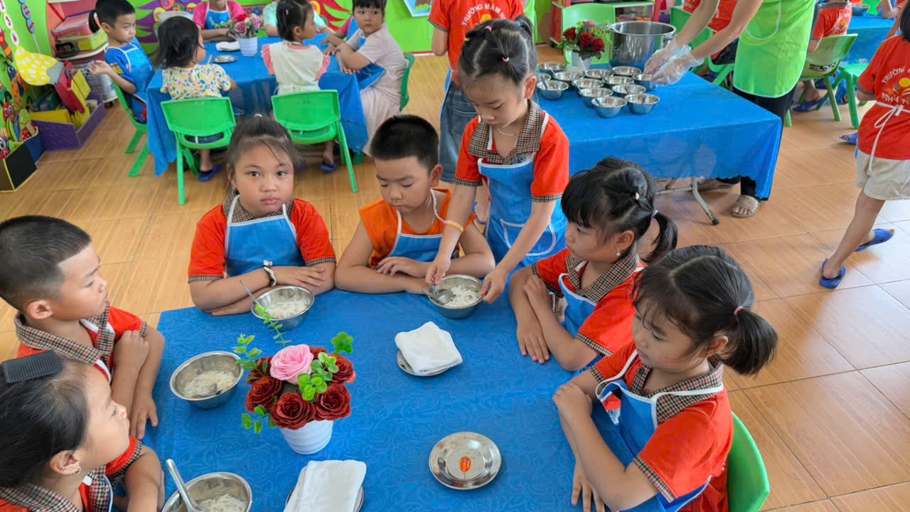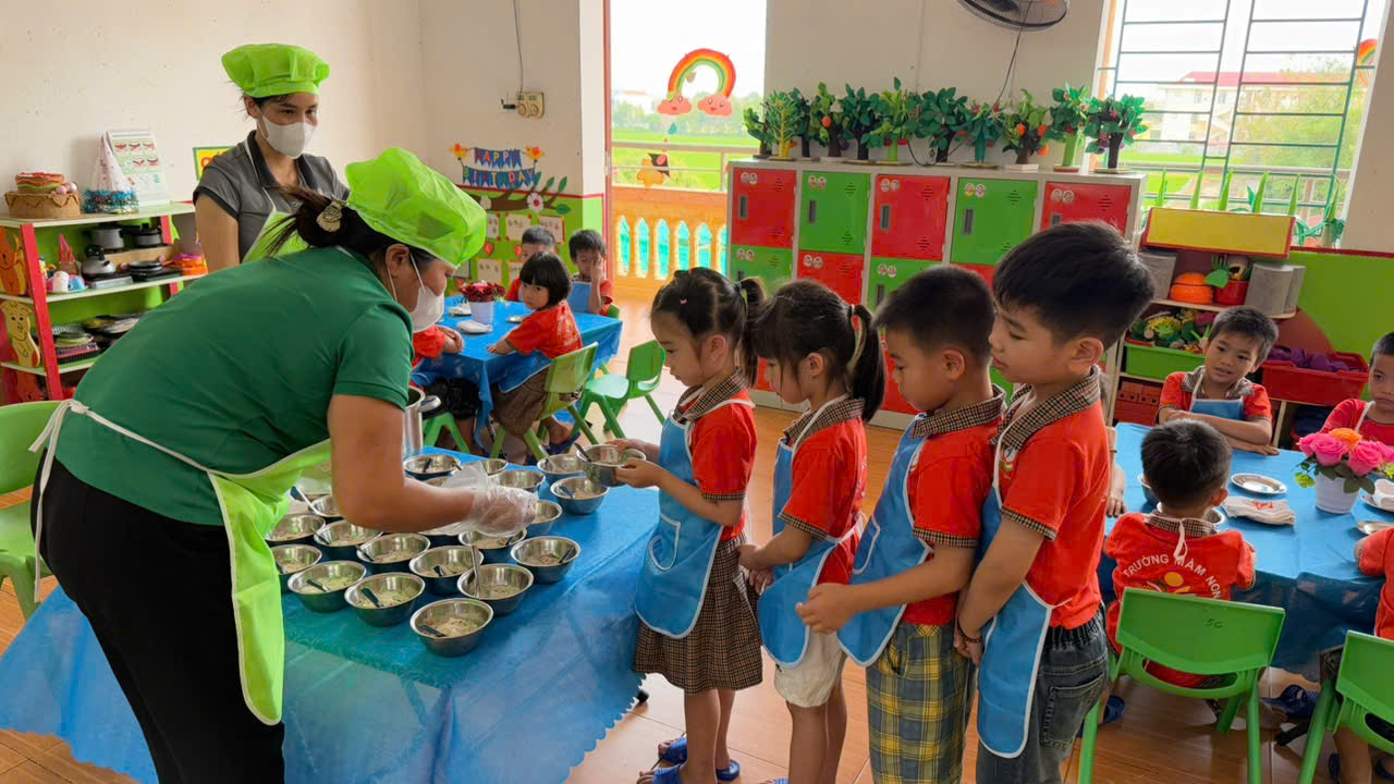 Hình ảnh các cô nuôi tận tình, chu đáo trong từng khâu chia suất ăn; các con lễ phép, trật tự khi nhận phần ăn của mình đã tạo nên một bức tranh thật đẹp trong hoạt động chăm sóc trẻ tại nhà trường. Không chỉ ăn ngon, các bé còn được rèn luyện kỹ năng tự phục vụ, tính kỷ luật và nề nếp trong sinh hoạt hằng ngày.
