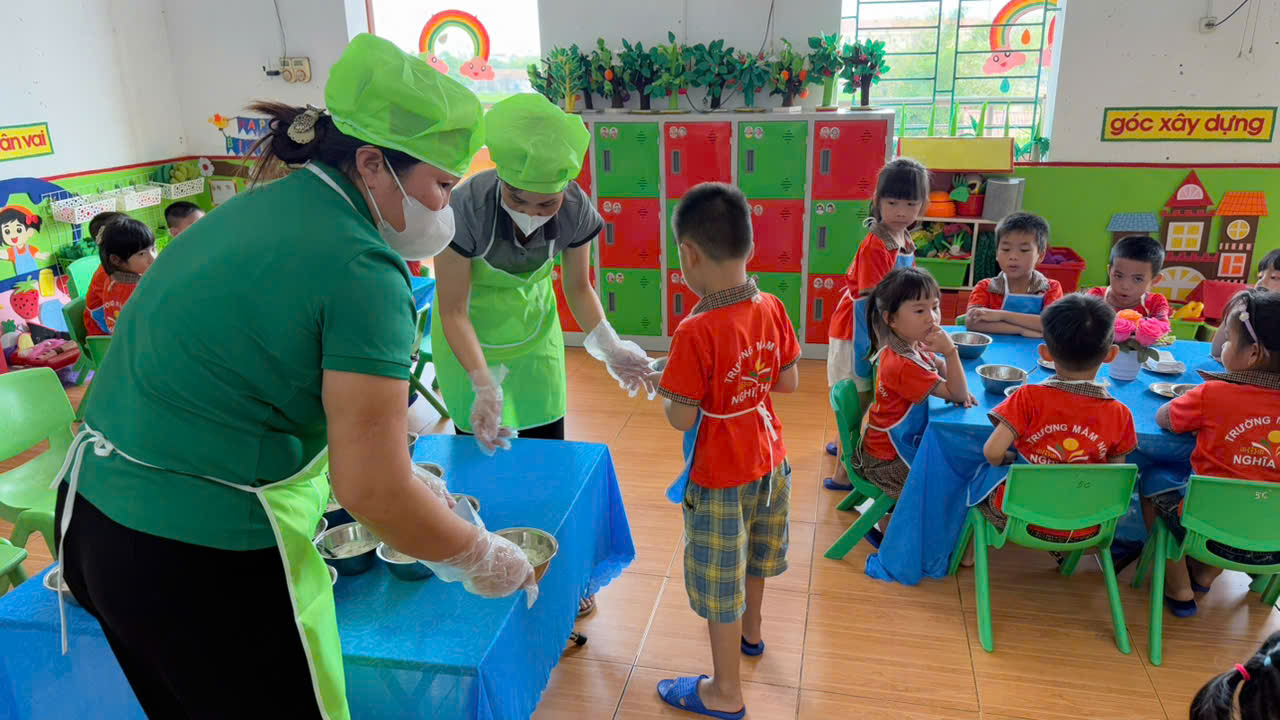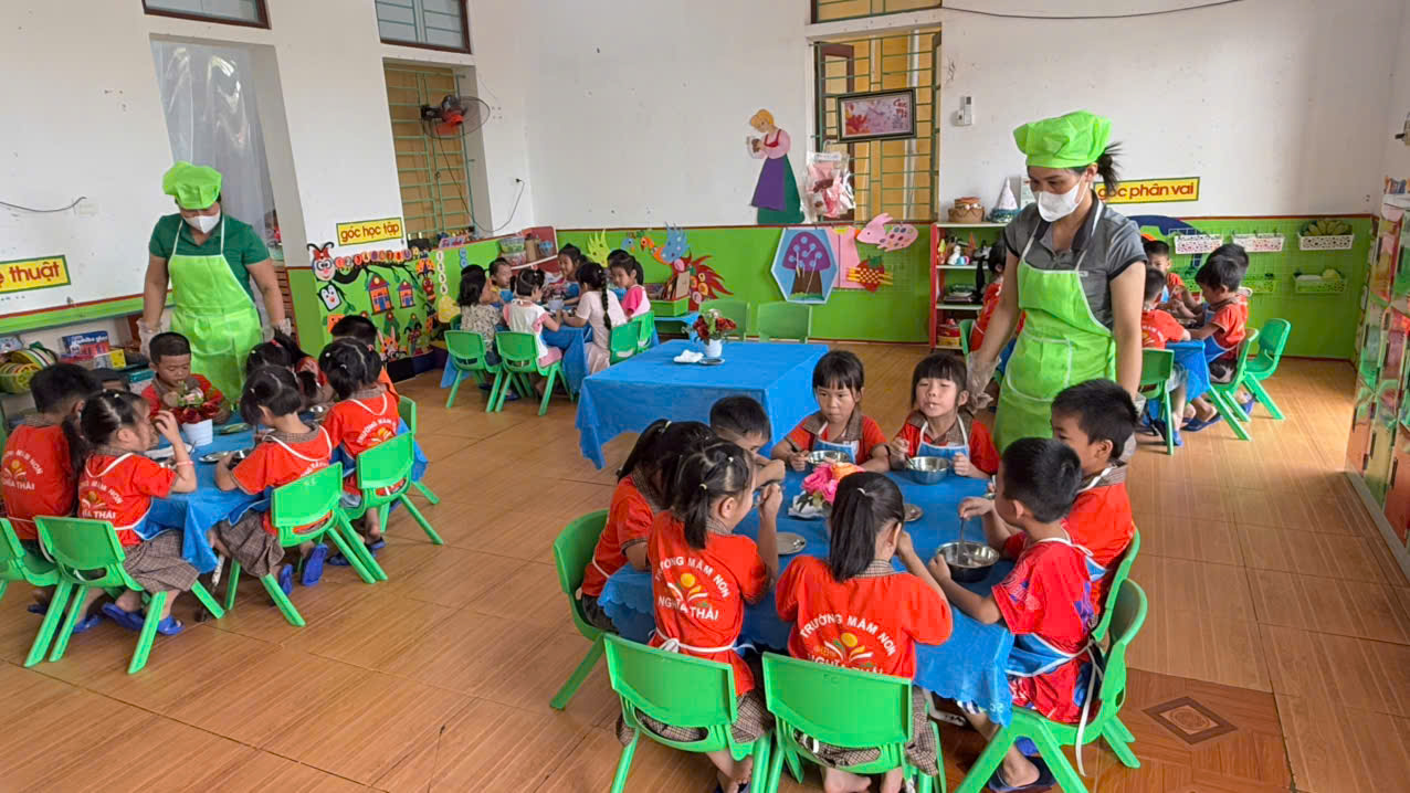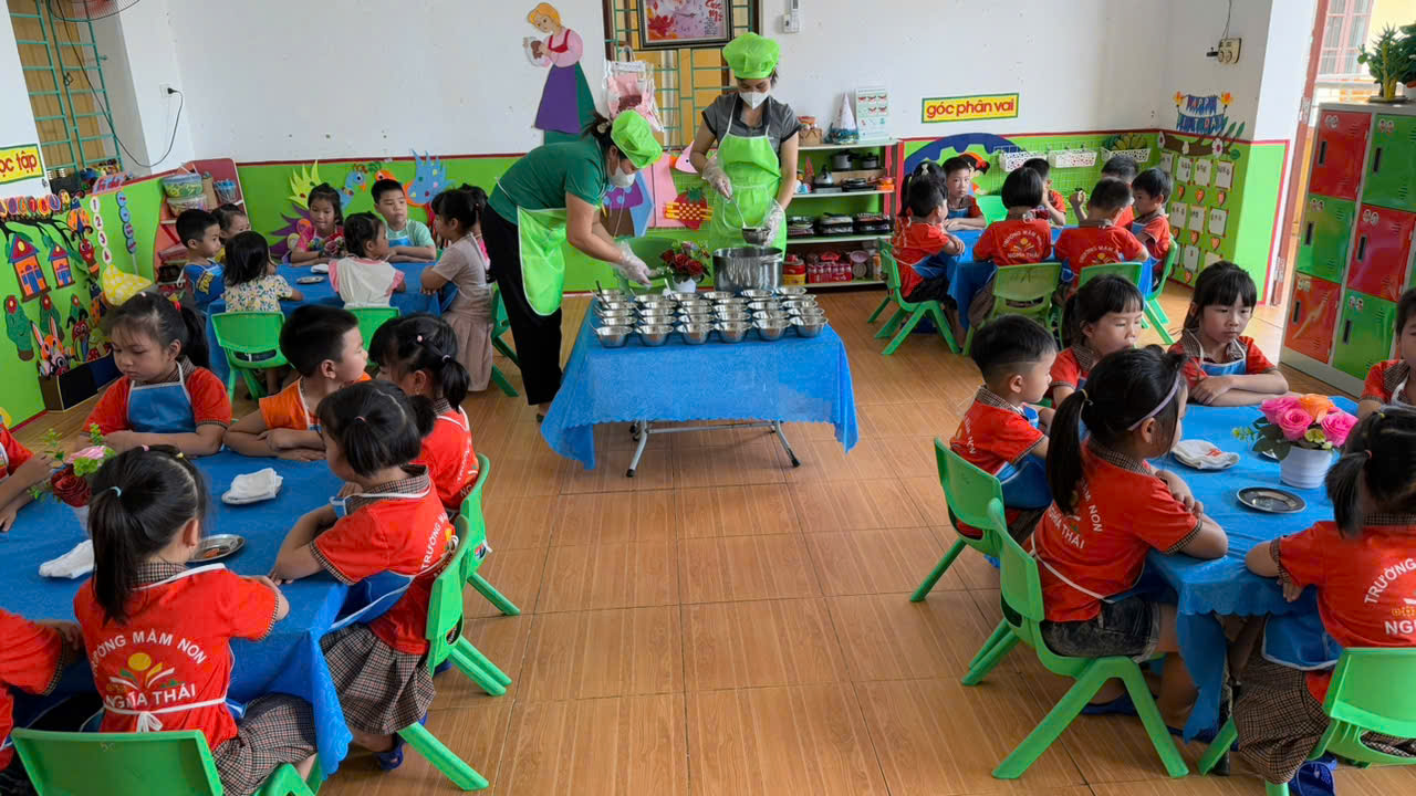 Tại Trường Mầm non Nghĩa Thái, công tác chăm sóc nuôi dưỡng luôn được nhà trường đặc biệt quan tâm, trong đó mỗi bữa ăn của trẻ không chỉ đảm bảo đầy đủ dinh dưỡng mà còn mang đến cho các con niềm vui và sự ấm áp.