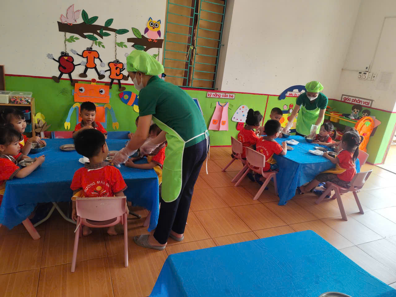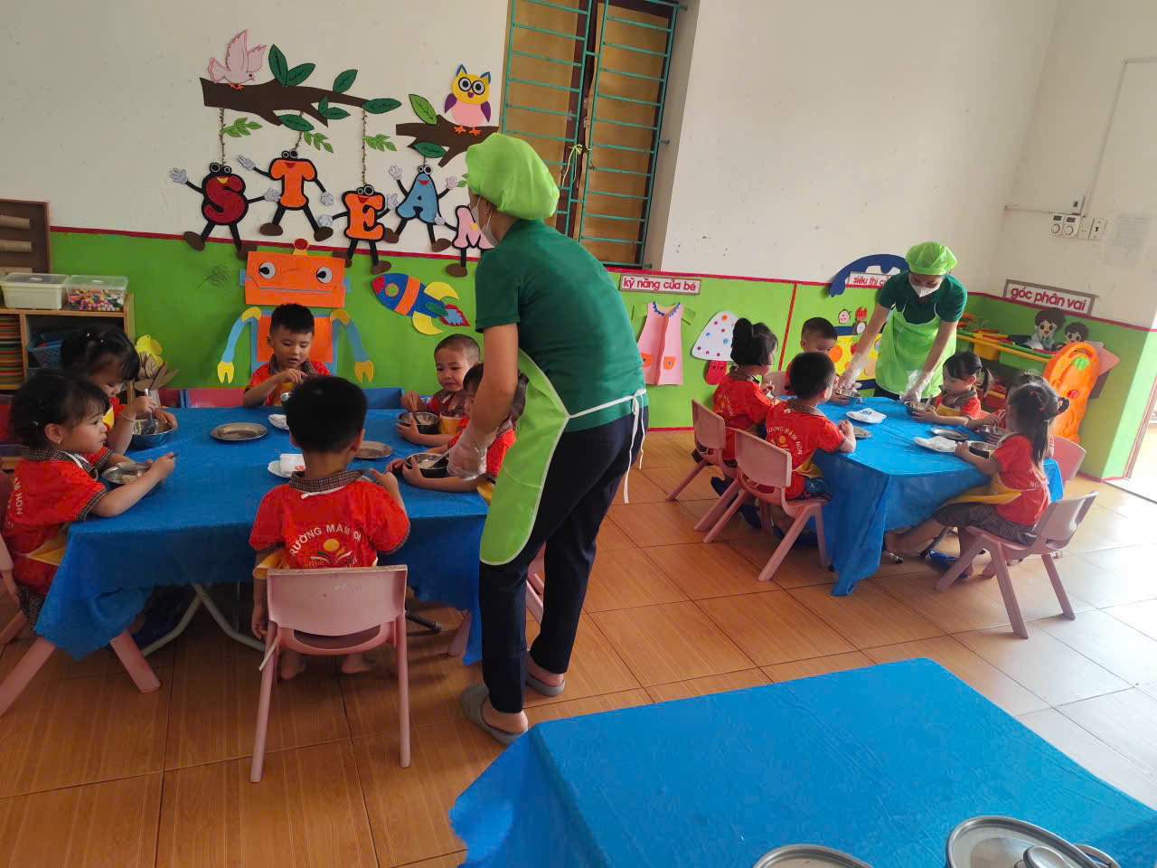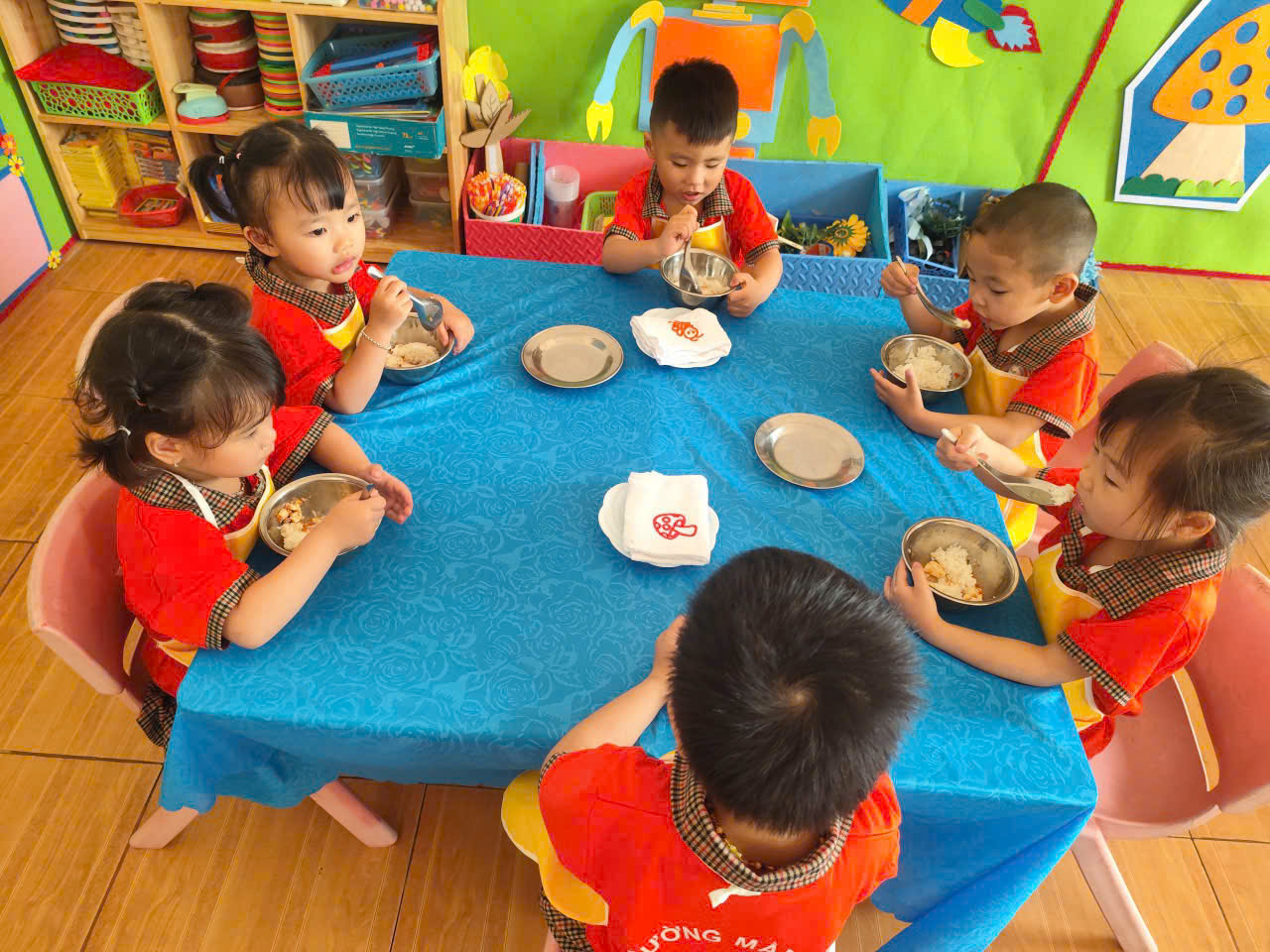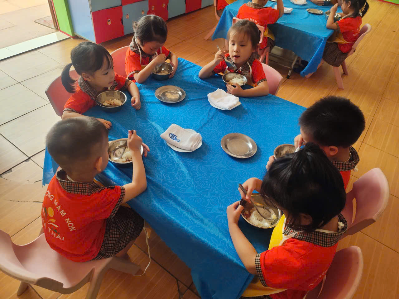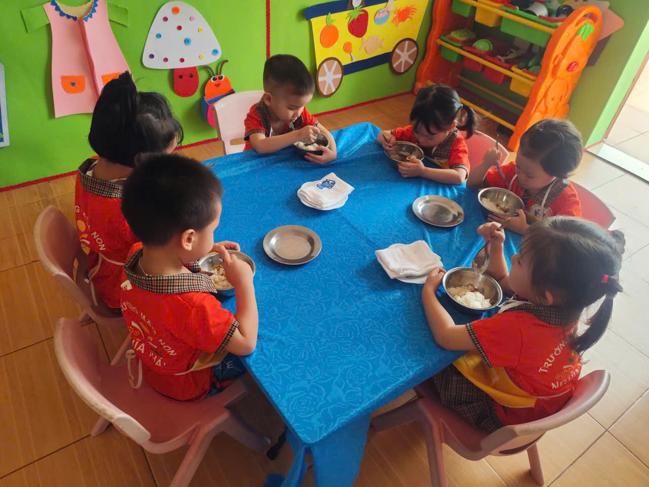 Nhờ sự quan tâm, chăm sóc chu đáo của cô giáo, các con đều ăn hết suất, đảm bảo đủ chất dinh dưỡng để phát triển khỏe mạnh. Bên cạnh đó, các con còn được rèn luyện kỹ năng tự phục vụ, biết giữ gìn vệ sinh và hình thành nề nếp trong giờ ăn.