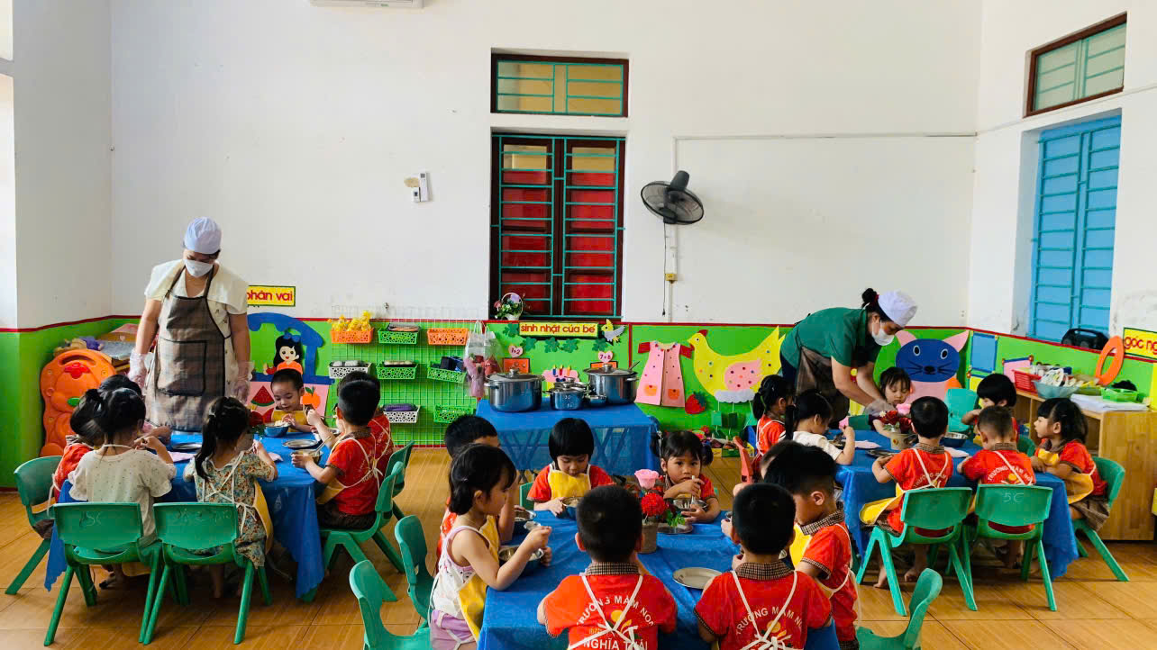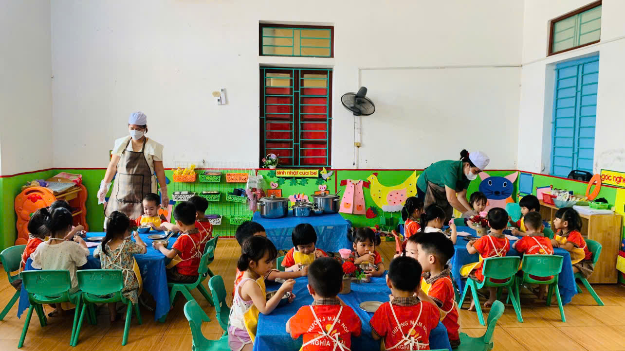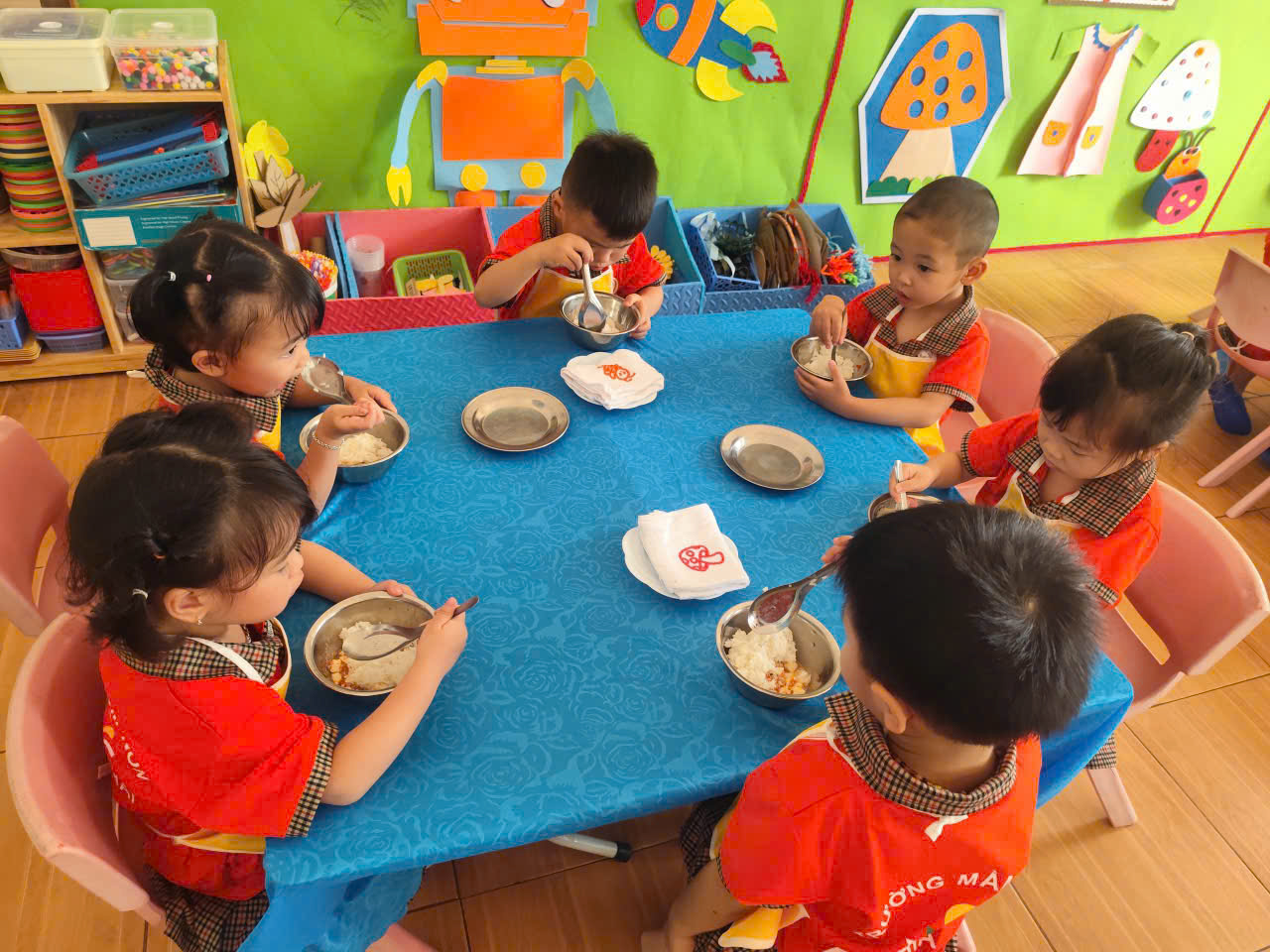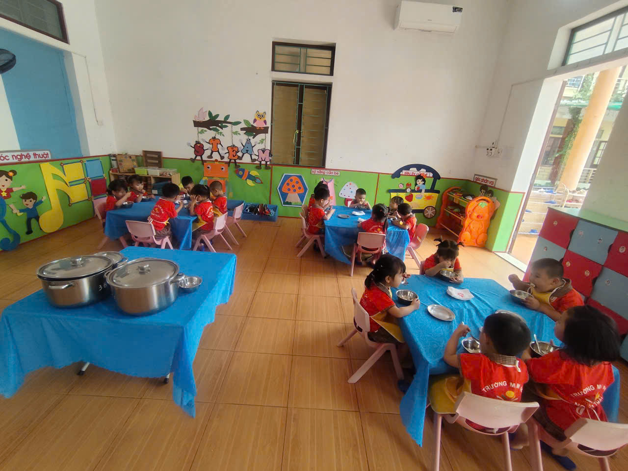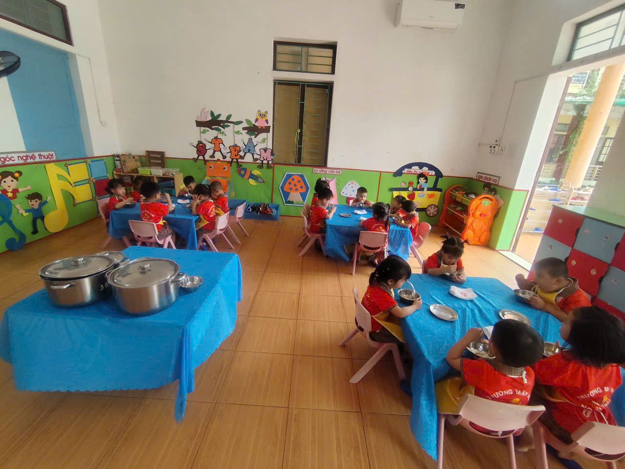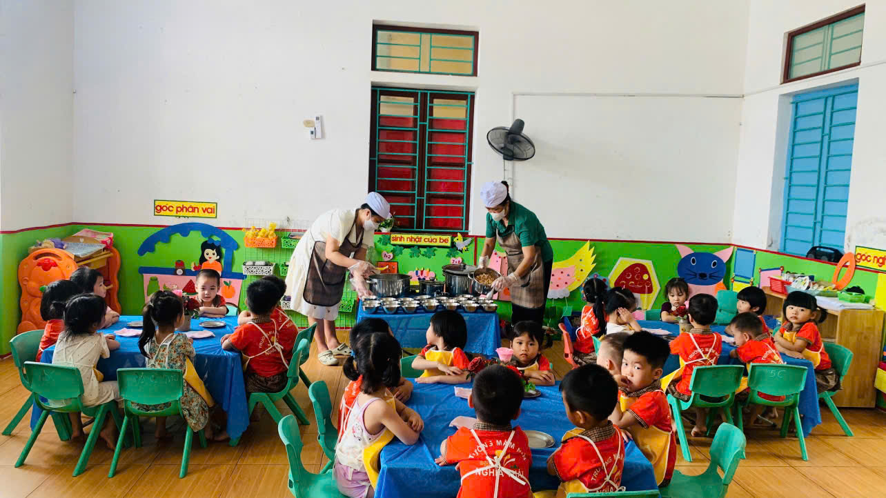 Nhờ sự quan tâm, chăm sóc chu đáo của cô giáo, các con đều ăn hết suất, đảm bảo đủ chất dinh dưỡng để phát triển khỏe mạnh. Bên cạnh đó, các con còn được rèn luyện kỹ năng tự phục vụ, biết giữ gìn vệ sinh và hình thành nề nếp trong giờ ăn.
