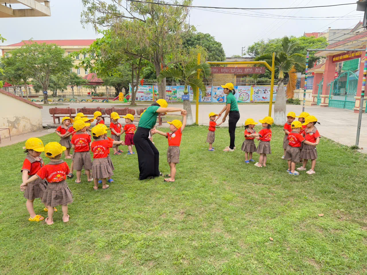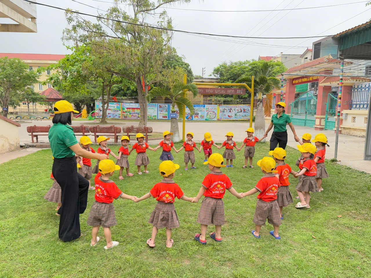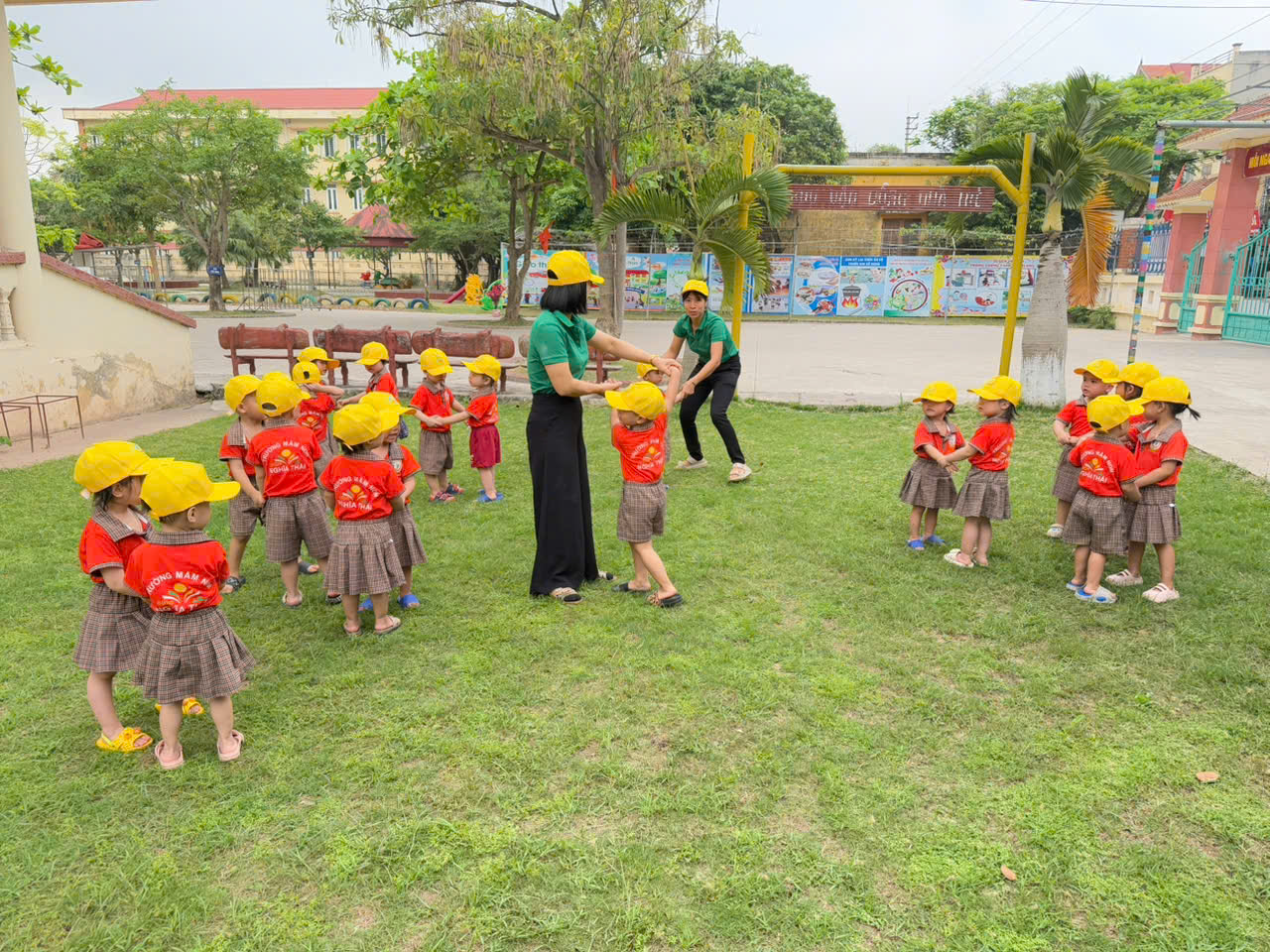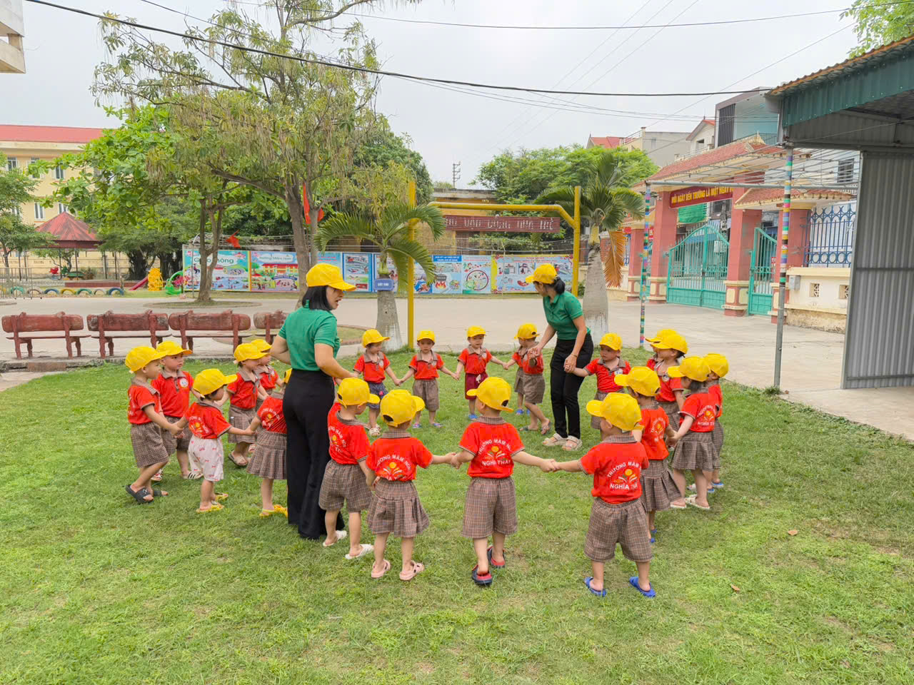 Trong không gian sân trường xanh mát, các con được tham gia nhiều trò chơi vận động nhẹ nhàng, phù hợp với lứa tuổi như nắm tay nhau tạo vòng tròn, cùng cô chơi các trò chơi tập thể, di chuyển theo hiệu lệnh… Dưới sự hướng dẫn tận tình của các cô giáo, các bé rất hào hứng, mạnh dạn và tích cực tham gia.
