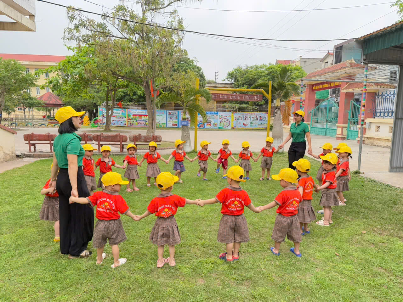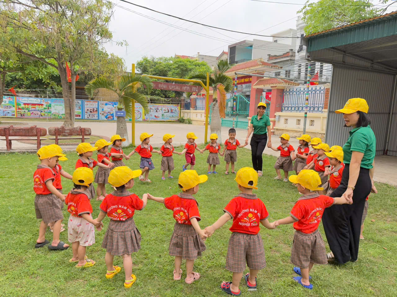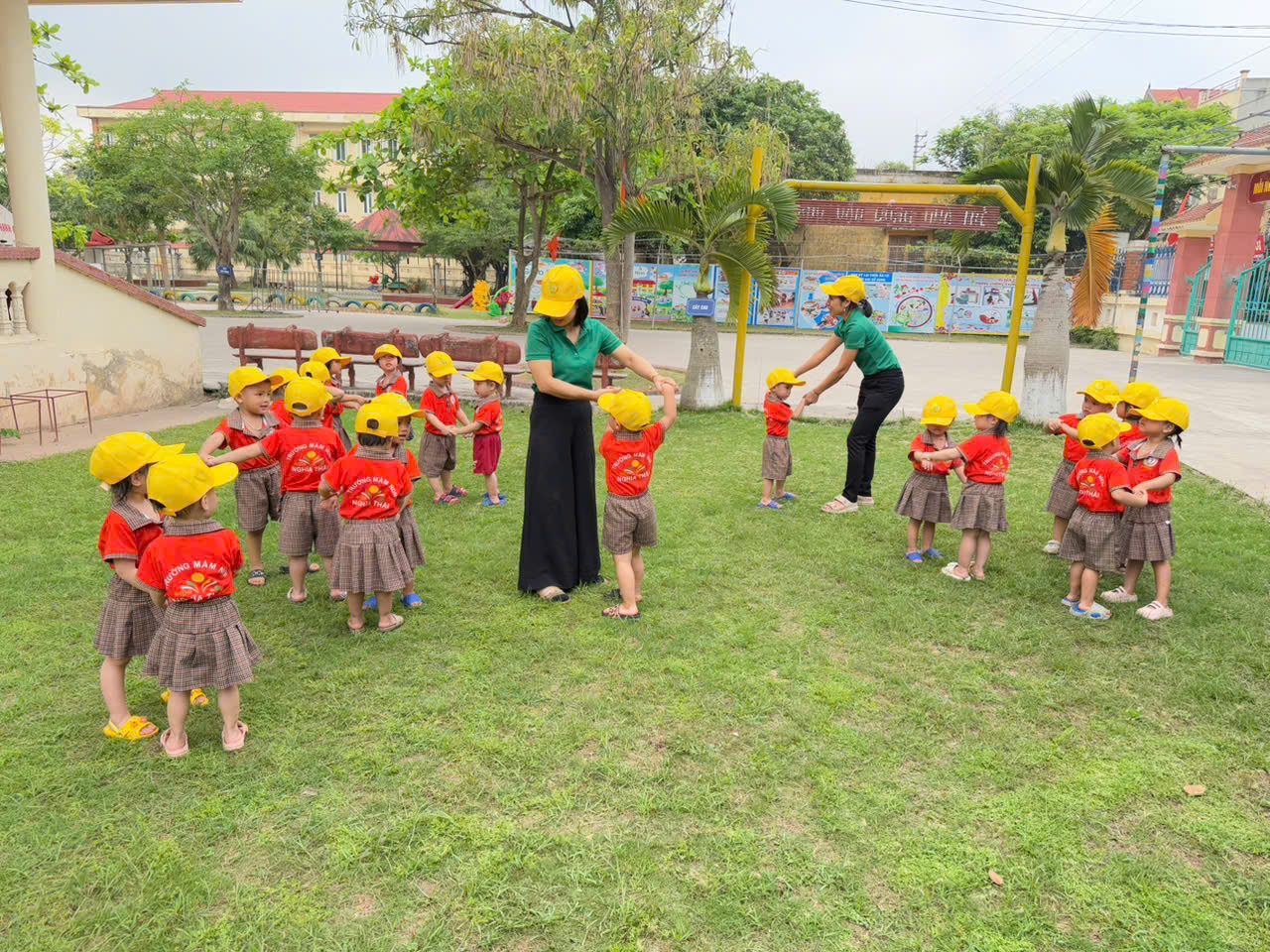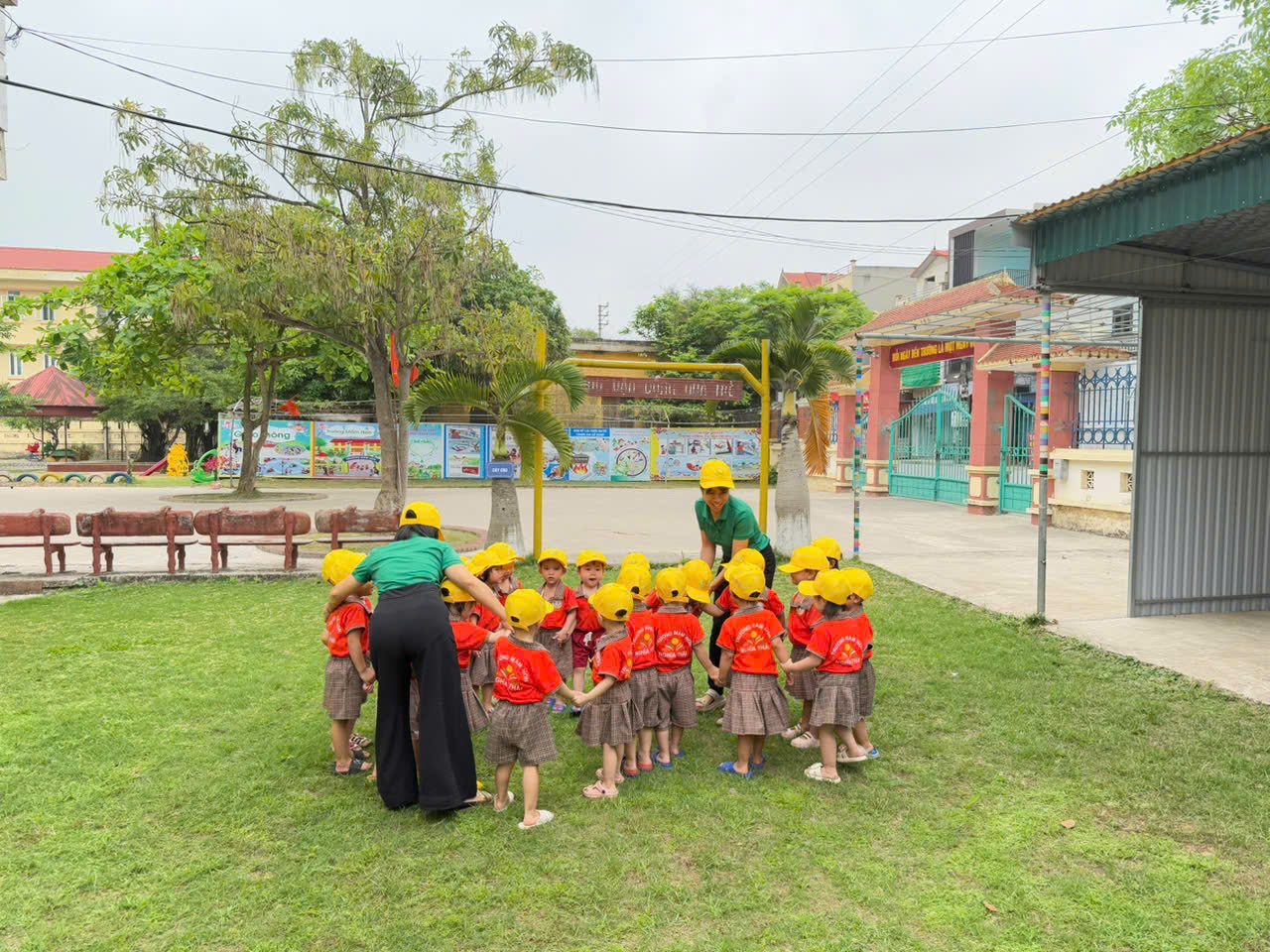 Trong không gian sân trường xanh mát, các con được tham gia nhiều trò chơi vận động nhẹ nhàng, phù hợp với lứa tuổi như nắm tay nhau tạo vòng tròn, cùng cô chơi các trò chơi tập thể, di chuyển theo hiệu lệnh… Dưới sự hướng dẫn tận tình của các cô giáo, các bé rất hào hứng, mạnh dạn và tích cực tham gia.