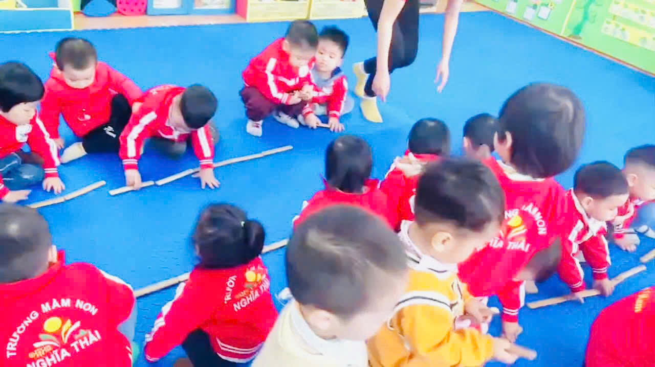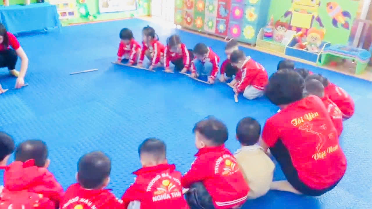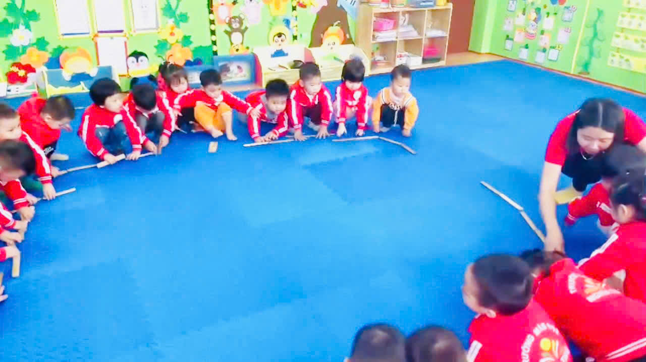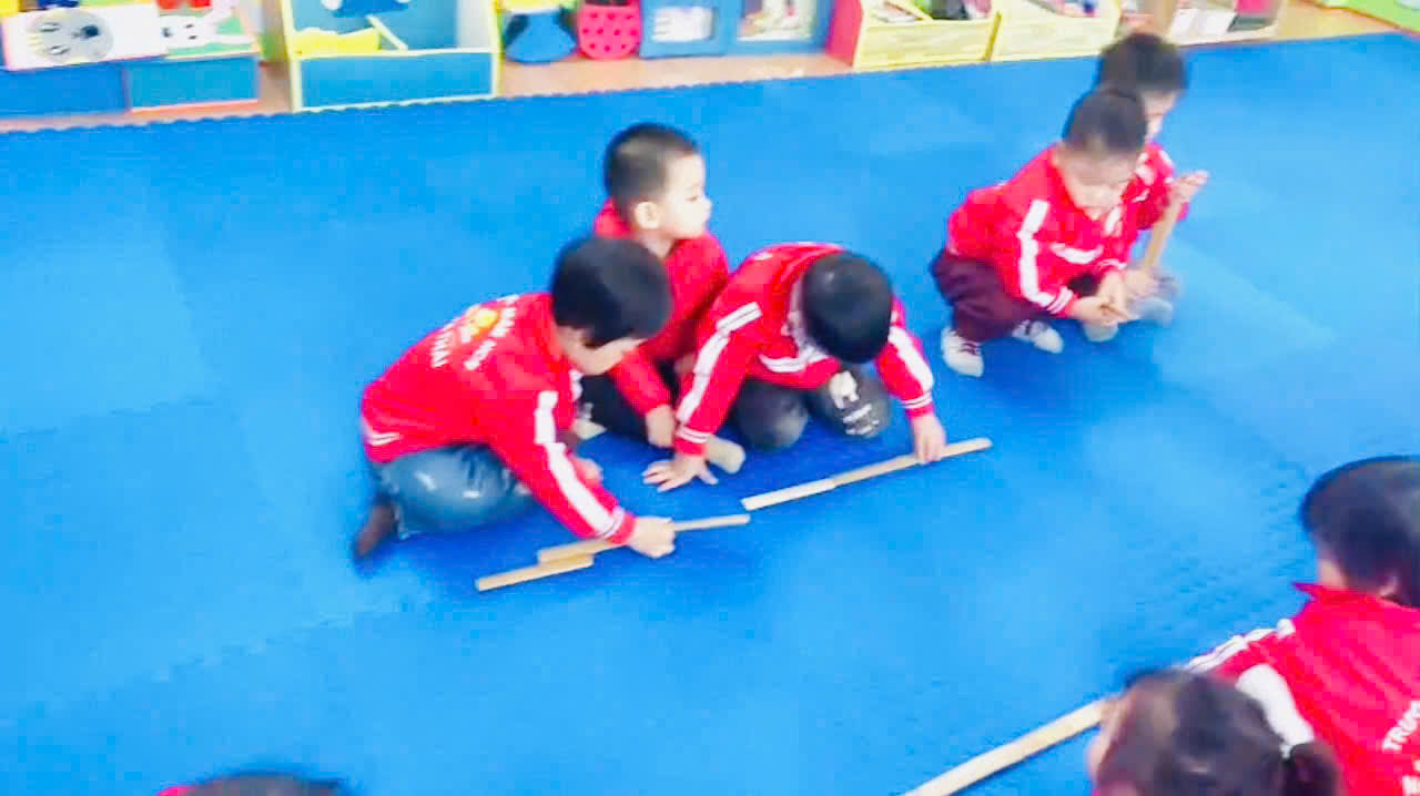 Trong giờ hoạt động, mỗi bé được cầm trên tay một thanh gỗ nhỏ xinh. Dưới sự hướng dẫn của cô, các con cùng nhau gõ thanh theo nhịp, tạo nên những âm thanh “cốc, cốc” vui tai. Có lúc các bé gõ theo hiệu lệnh, có lúc lại tự do sáng tạo nhịp điệu riêng của mình, tạo nên không khí lớp học thật sôi nổi và hào hứng.