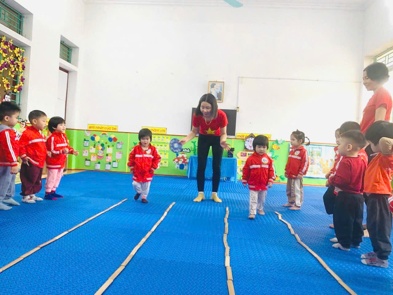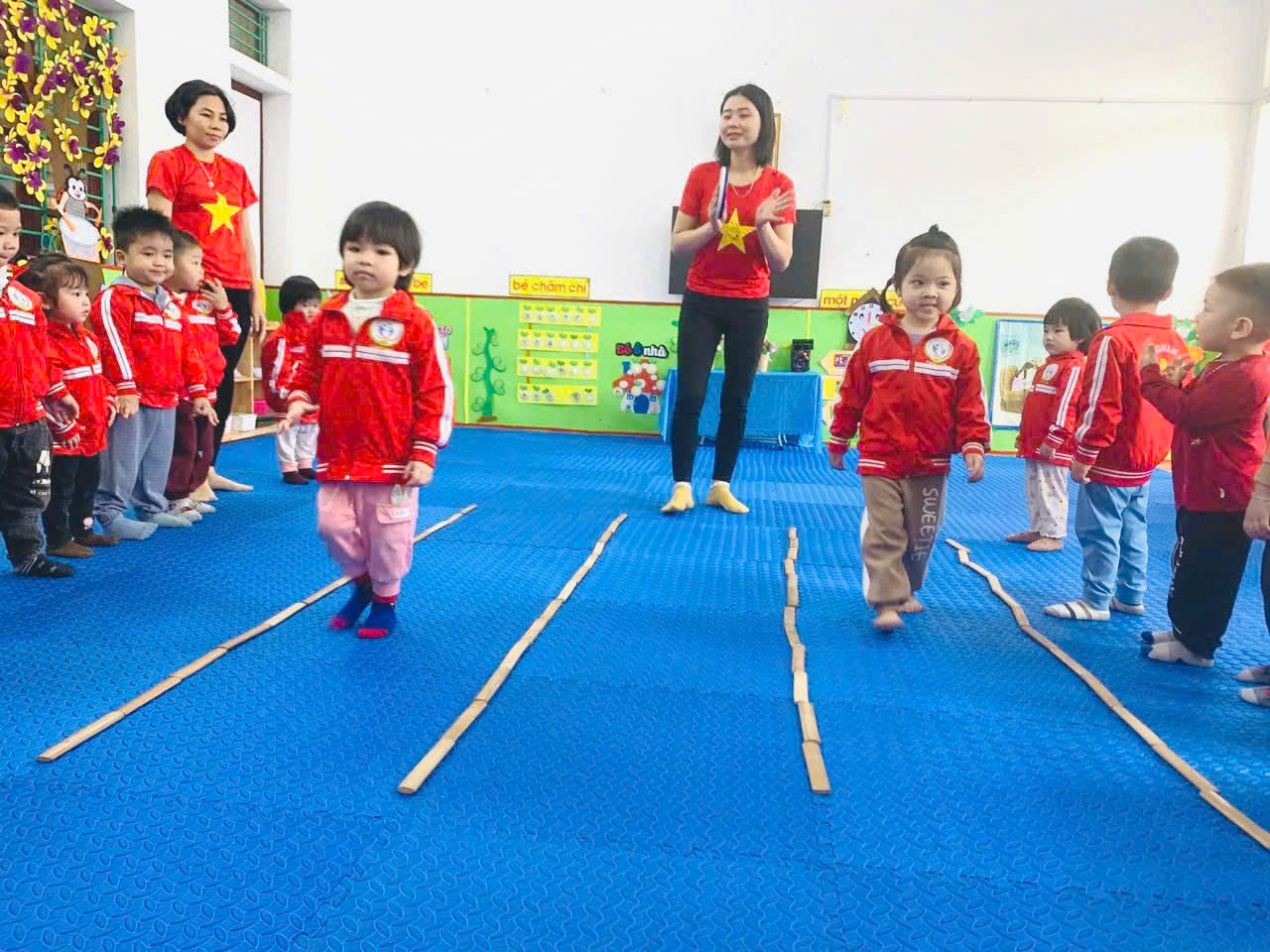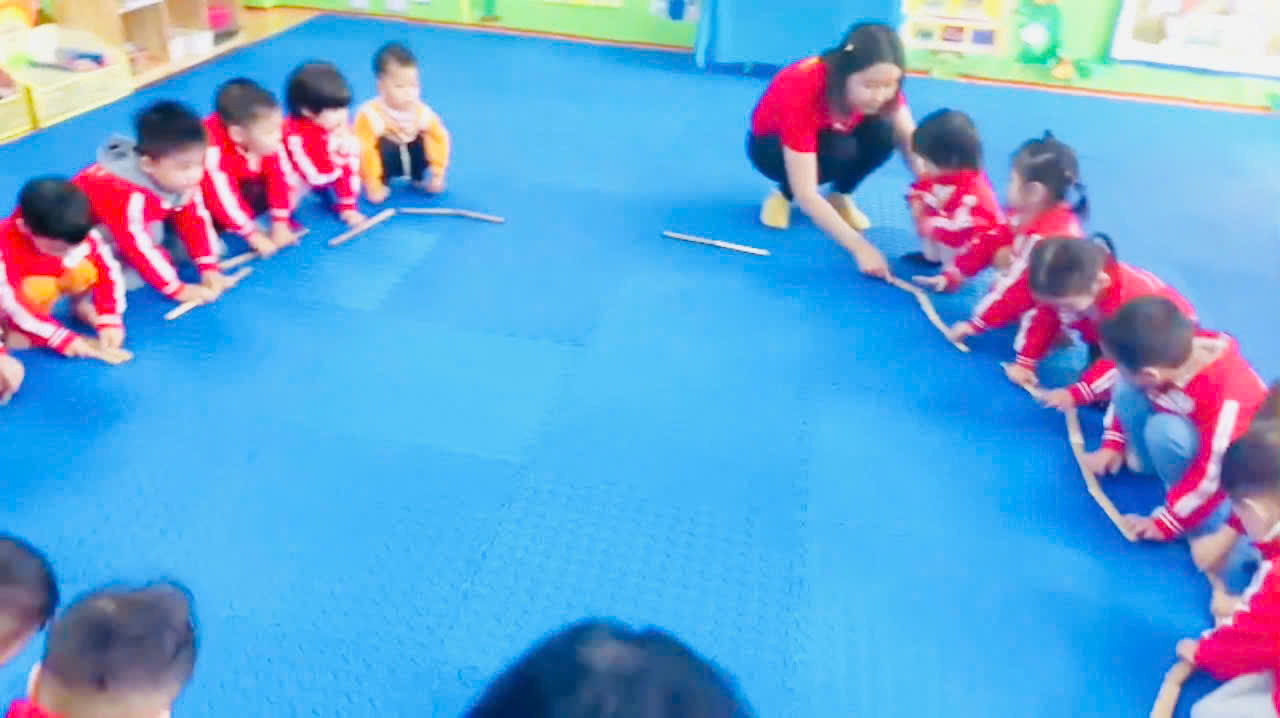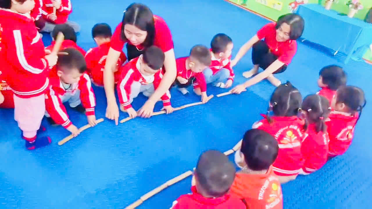 Trong giờ hoạt động, mỗi bé được cầm trên tay một thanh gỗ nhỏ xinh. Dưới sự hướng dẫn của cô, các con cùng nhau gõ thanh theo nhịp, tạo nên những âm thanh “cốc, cốc” vui tai. Có lúc các bé gõ theo hiệu lệnh, có lúc lại tự do sáng tạo nhịp điệu riêng của mình, tạo nên không khí lớp học thật sôi nổi và hào hứng.