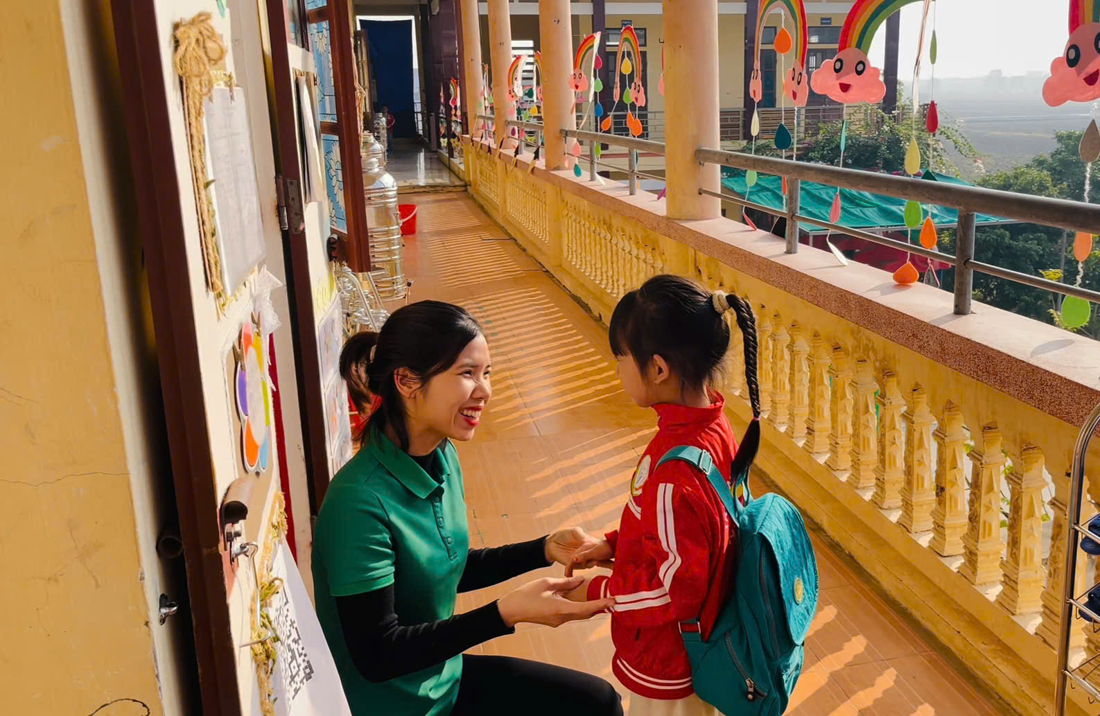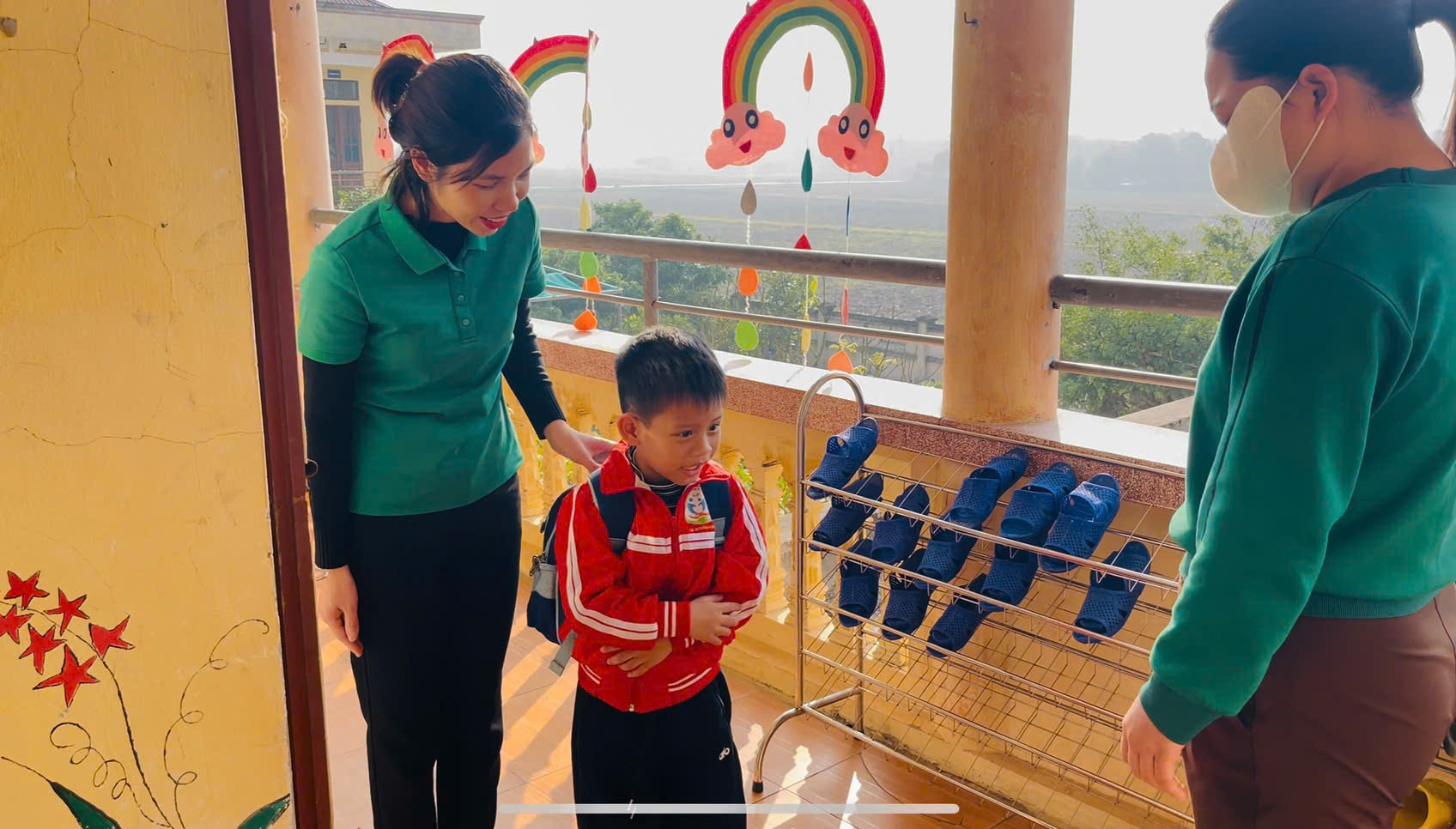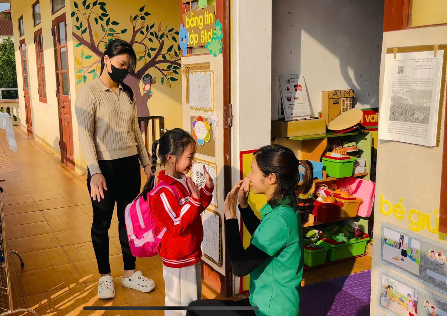 Mỗi buổi sáng đến trường của các bé lớp 5 tuổi D luôn diễn ra trong không khí vui tươi, thân thiện và đầy ắp yêu thương. Ngay từ giờ đón trẻ, cô giáo ân cần chào hỏi, quan tâm đến sức khỏe, tâm trạng của từng trẻ; đồng thời trao đổi nhanh với cha mẹ để nắm bắt tình hình của các con, giúp trẻ yên tâm bước vào ngày học mới.