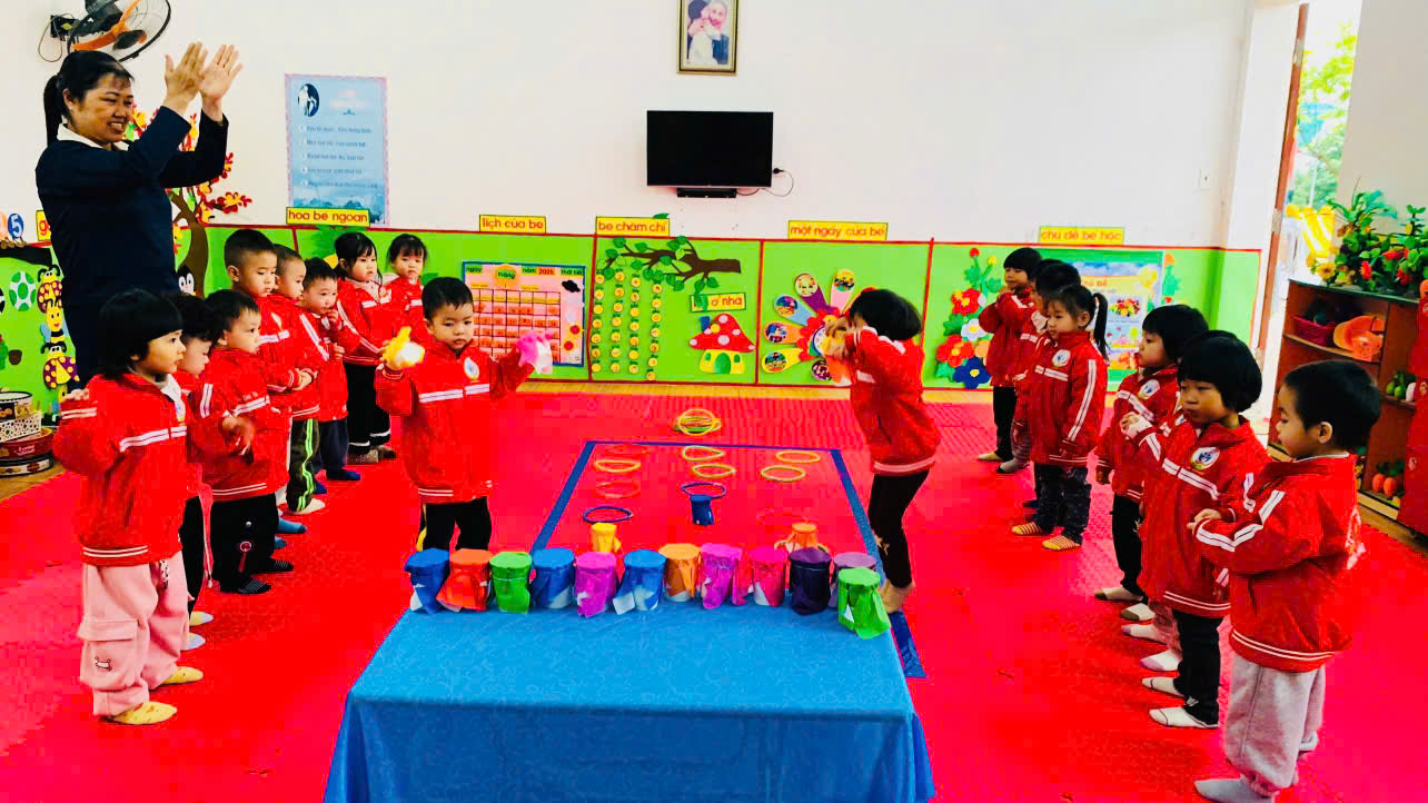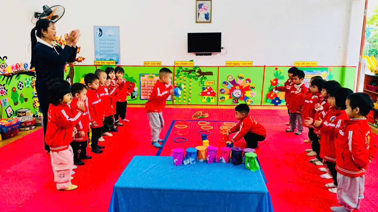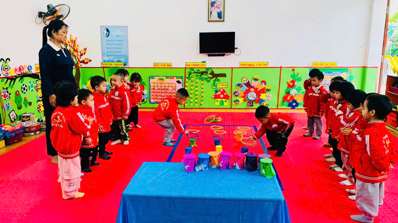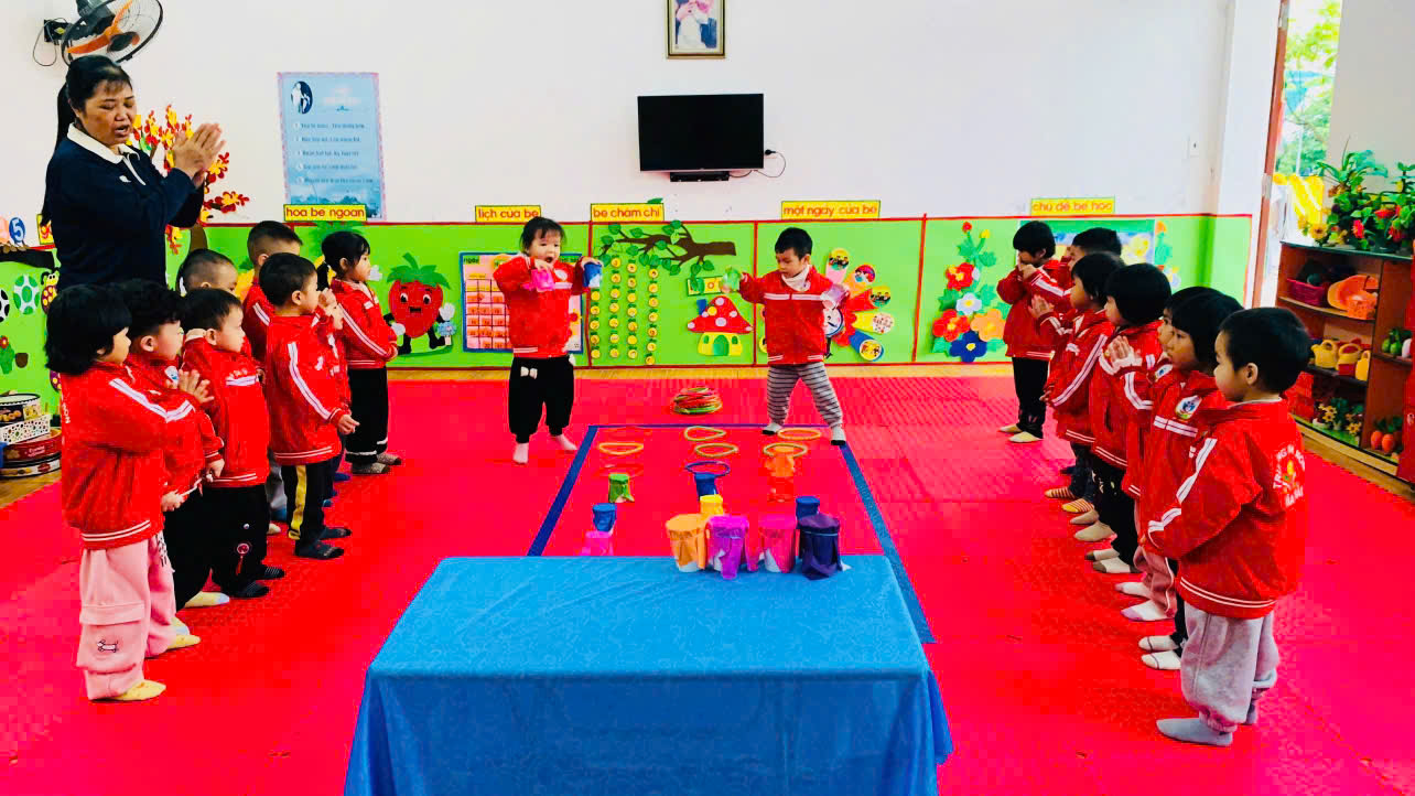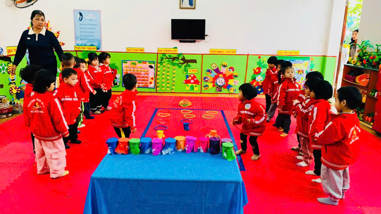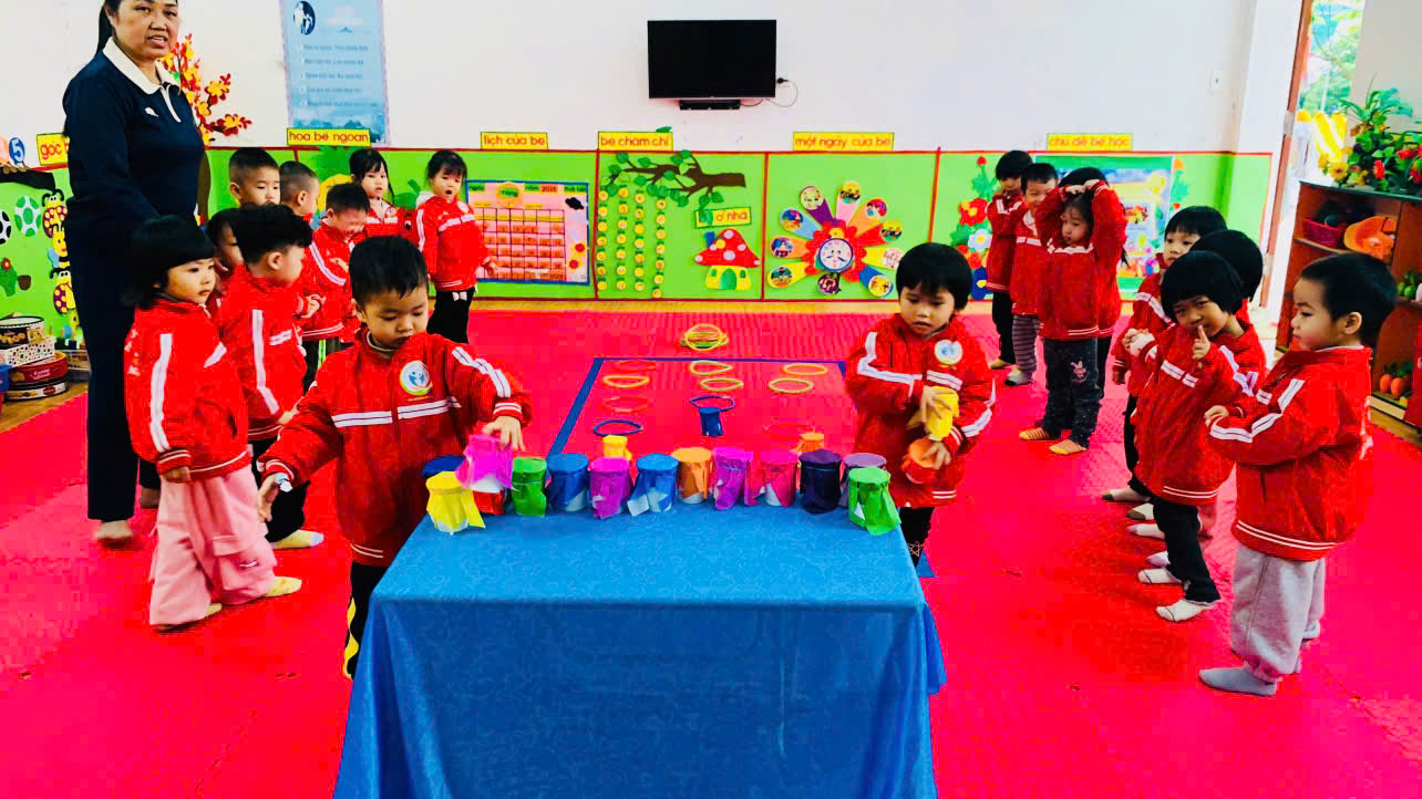 Trong không gian lớp học được trang trí rực rỡ sắc xuân, cô giáo đã tổ chức cho các con chơi trò ném vòng vào những phần quà đầy màu sắc. Trò chơi tuy đơn giản nhưng mang lại nhiều niềm vui, giúp trẻ rèn luyện sự khéo léo, khả năng phối hợp tay – mắt, đồng thời phát triển kỹ năng vận động và sự tự tin khi tham gia hoạt động tập thể.