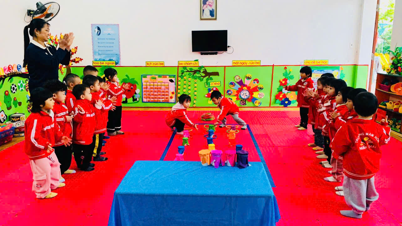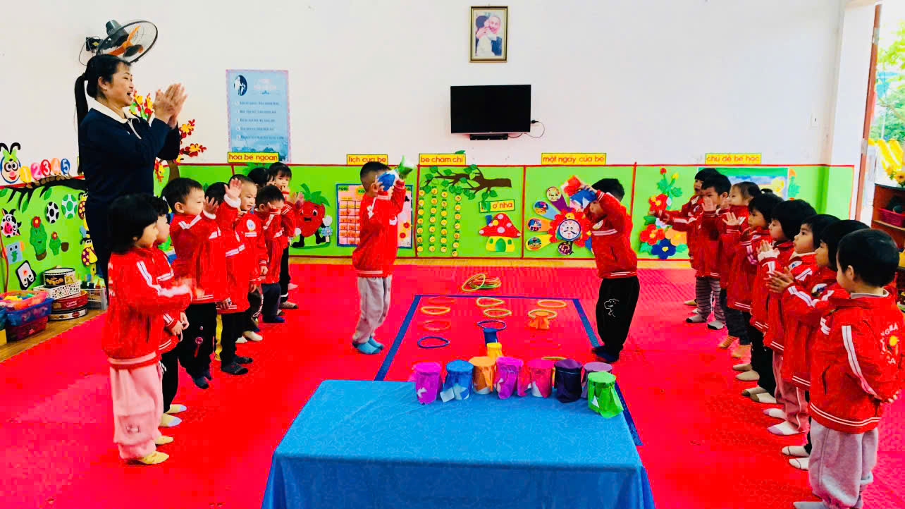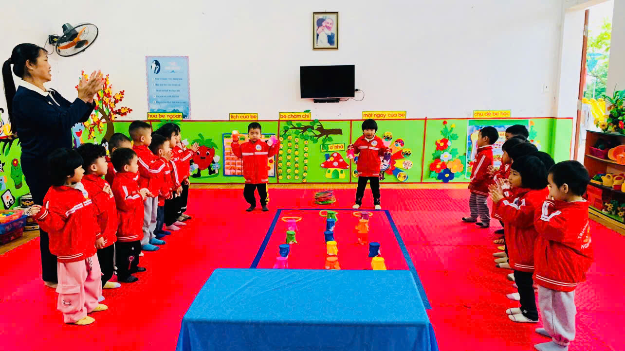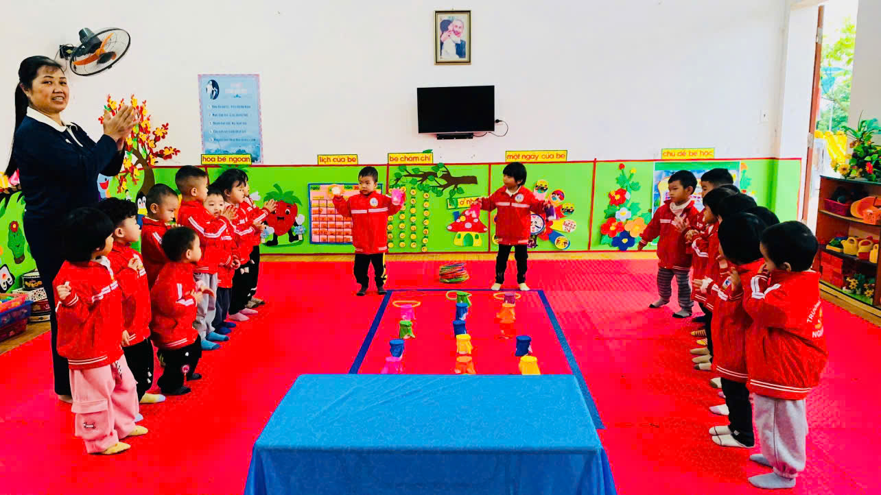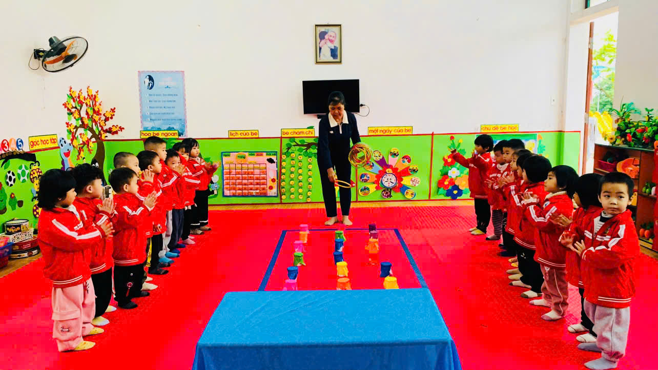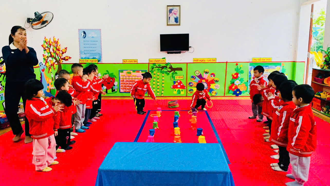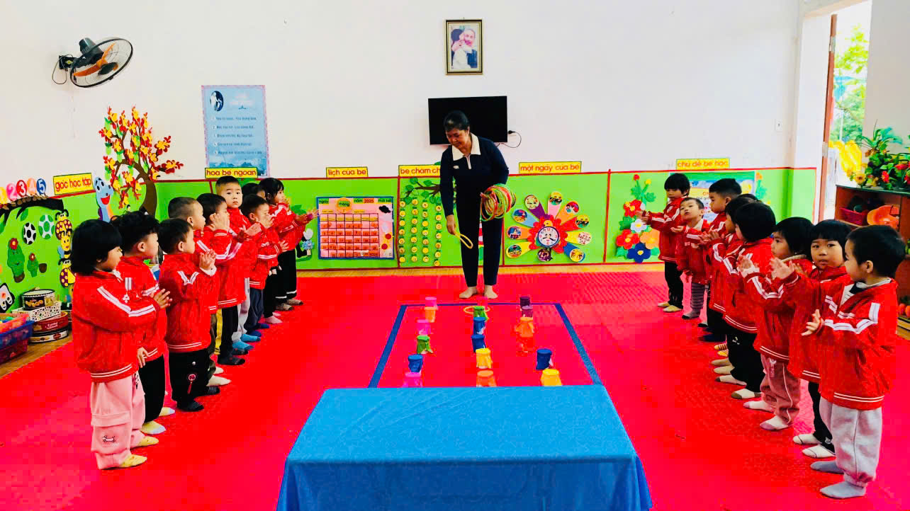 Trong không gian lớp học được trang trí rực rỡ sắc xuân, cô giáo đã tổ chức cho các con chơi trò ném vòng vào những phần quà đầy màu sắc. Trò chơi tuy đơn giản nhưng mang lại nhiều niềm vui, giúp trẻ rèn luyện sự khéo léo, khả năng phối hợp tay – mắt, đồng thời phát triển kỹ năng vận động và sự tự tin khi tham gia hoạt động tập thể.